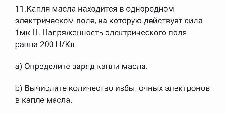 Физика. Ответ нужен срочно. Капля масла находится в однородном электрическом поле, на которую действует сила 1мк Н. Напряженность электрического поля равна 200 Н/Кл.