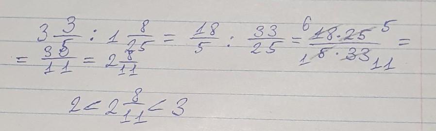 3 3/5:1 8/25=2 8/11 (решение на листочке), оно находится между натуральными числами 2 и 3