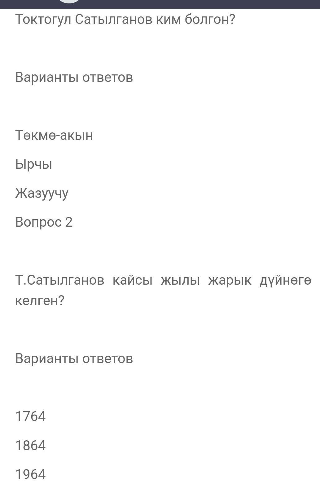 Ответ на вопрос 2:Т.Сатылганов 1964 жылы жарык дүйнөгө келген.