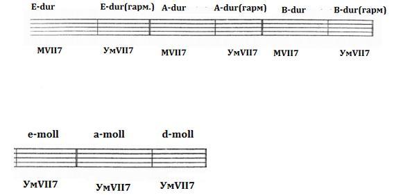 MVII7 строится в натуральном мажоре на 7 ступени, УмVII7 строится в гармоническом миноре на 7 повышенной ступени и в гармоническом мажоре на 7 ступени. Разрешается в Т53 с удвоением терции