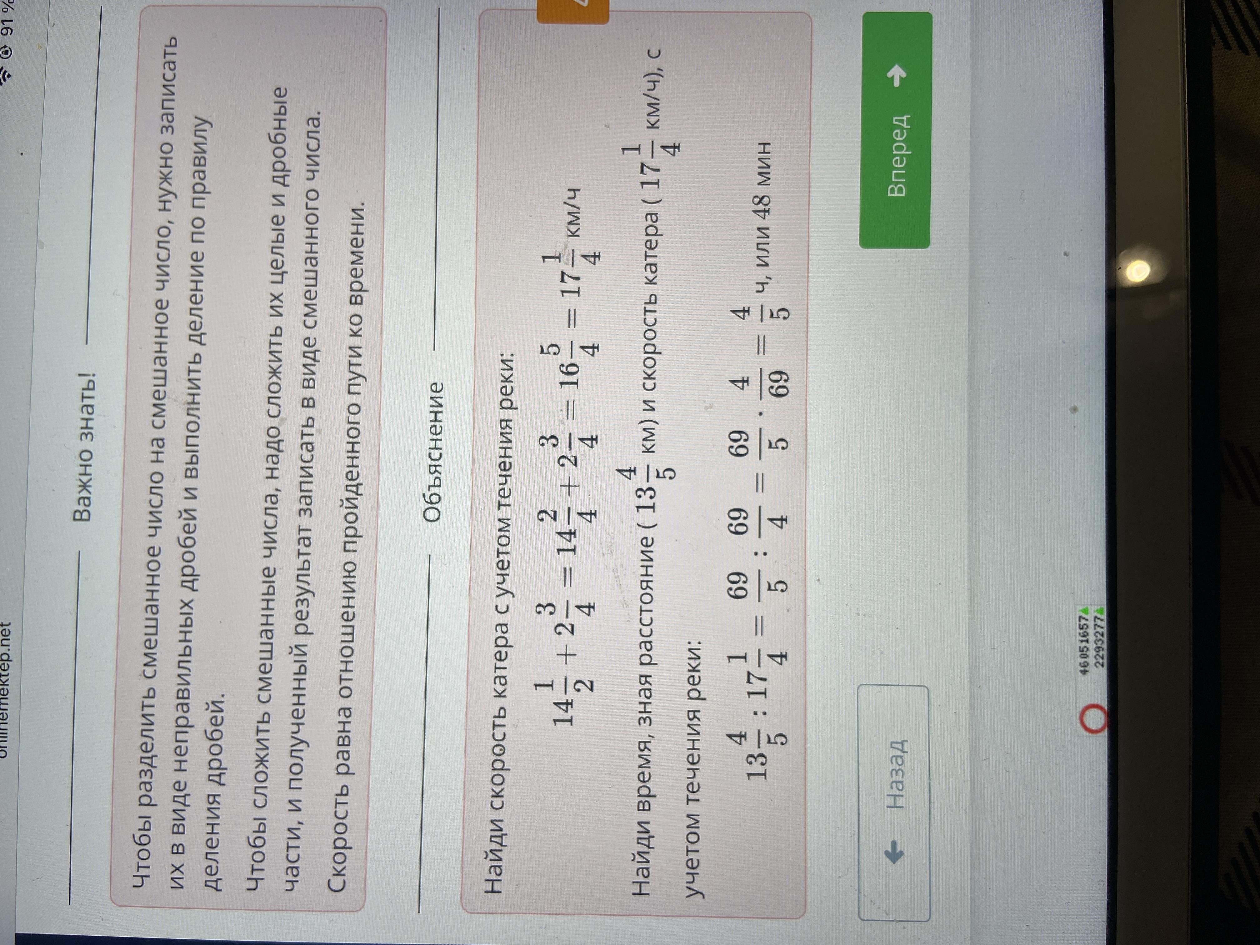 собственная скорость катера-14 1/2 км/ч.Скорость течения реки- 2 3/4 км/ч.За какое время катер проплывает расстояние 13 4/5 км по течению реки?