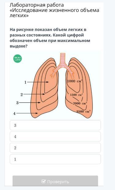 На рисунке показан объем легких в разных состояниях. Какой цифрой обозначен объем при максимальном выдохе?