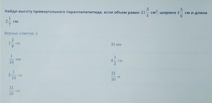 найди высоту прямоугольника параллелепипеда если объем равен 21 3/4 см. ширина 4 5/6 и длина пжжжжжжжжжж❤️❤️❤️❤️❤️❤️❤️