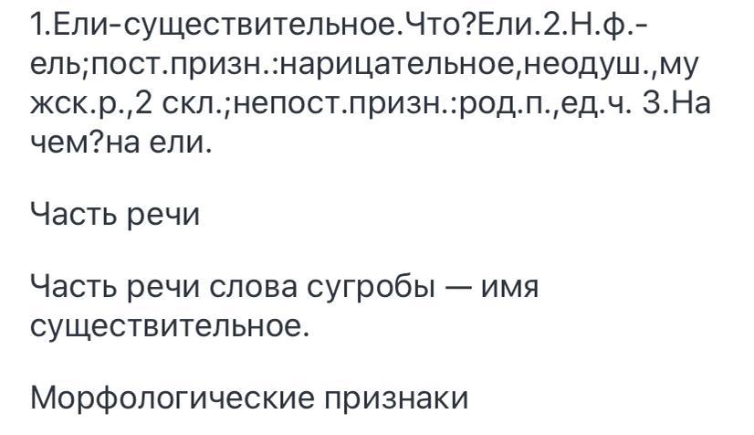 1.Ели-существительное.Что?Ели.2.Н.ф.-ель;пост.призн.:нарицательное,неодуш.,мужск.р.,2 скл.;непост.призн.:род.п.,ед.ч. 3.На чем?на ели.