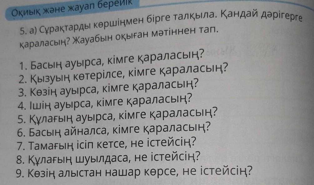 5. а) Сұрақтарды көршіңмен бірге талқыла. Қандай дәрігерге