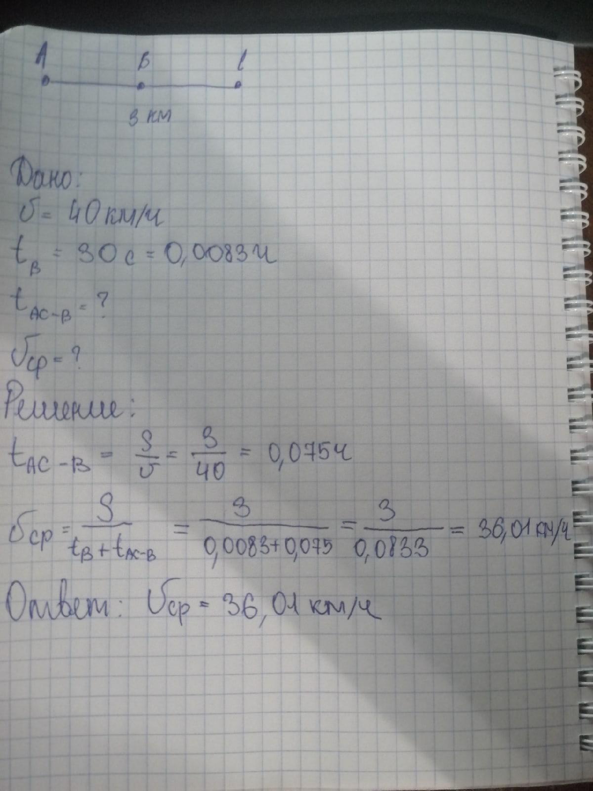 1. Автобус проехал от остановки А до остановки С. Между остановками А и С находится остановка В, на которой автобус простоял 30 с. Расстояние между остановками одинаково и равно 1,5 км. Автобус между остановками движется с одинаковой скоростью 40 км/ч. Найти среднюю скорость автобуса при движении от остановки А до остановки С. *