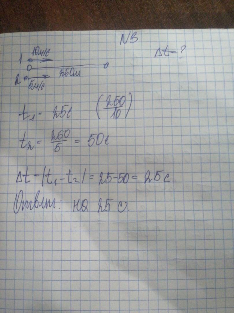 3. Два школьника сидели рядом и увидели третьего на расстоянии 250 м от себя, в конце прямого коридора, и одновременно пошли ему навстречу. Первый школьник двигался со скоростью 10 м/c, а второй - 5 м/c. Насколько раньше первый школьник дойдет до третьего, чем второй. *