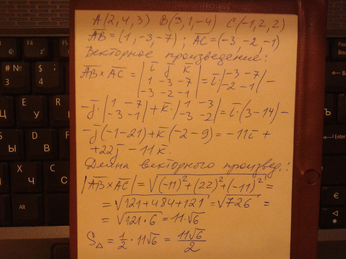 Используя векторное (добуток) произведение векторов. Вычислить площадь треугольника с вершинами A,B,C