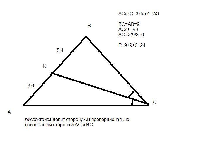в равнобедренном треугольнике биссектриса проведенная к боковой стороне ,делит ее на отрезки 3,6 и 5,4 считая от основания найдите периметр треугольника