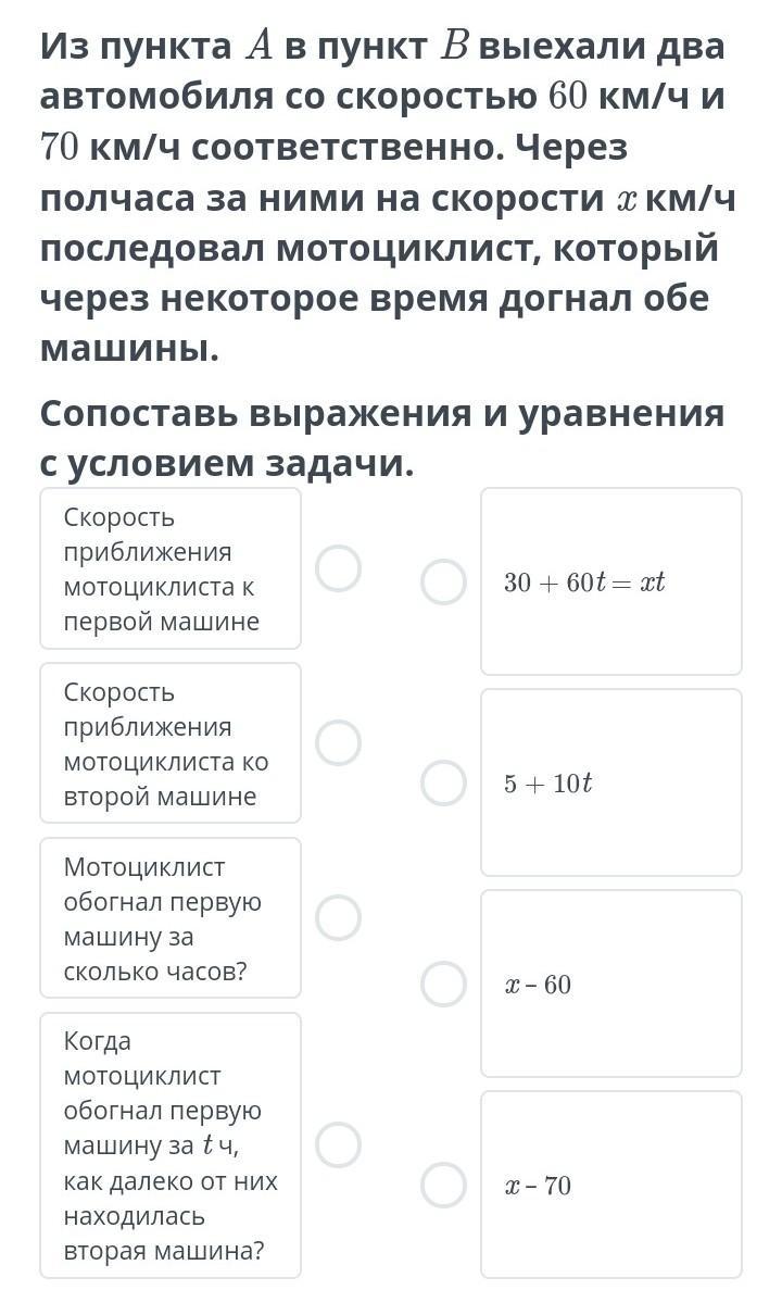 мотоциклист обогнал первую машину за сколько минут?--- 30+60t=xt