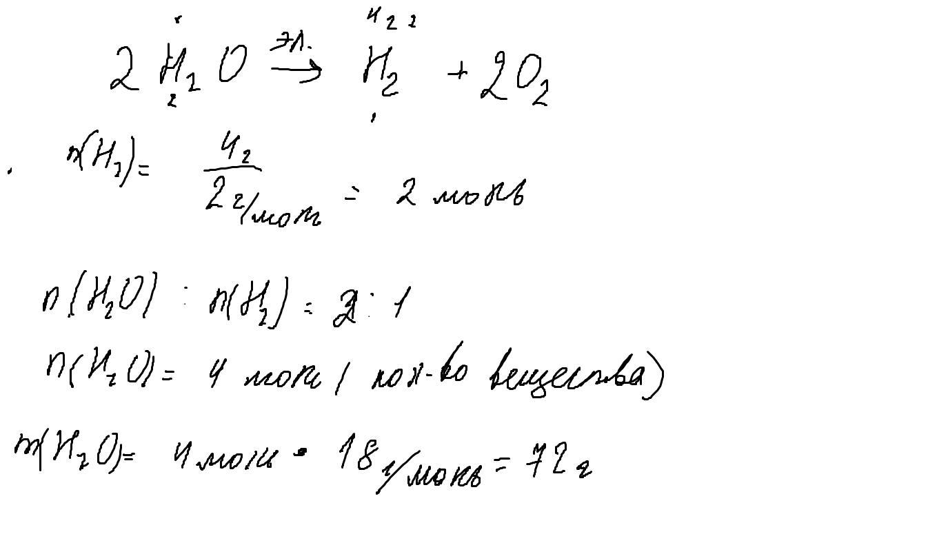 6. водород-топливо xxi века. его можно получить в лаборатории, отключив воду. Определите массу воды и количество вещества, необходимое для получения 4 г водорода.