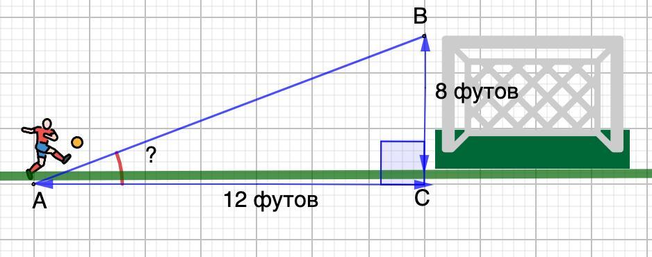 Футбольный мяч расположен на расстоянии 12 футов от ворот, которые составляют 8 футов в высоту. Футболист пнул мяч и он попадает в верхнюю перекладину напротив него. Чему равен угол удара футболиста? Ответ округли до целых