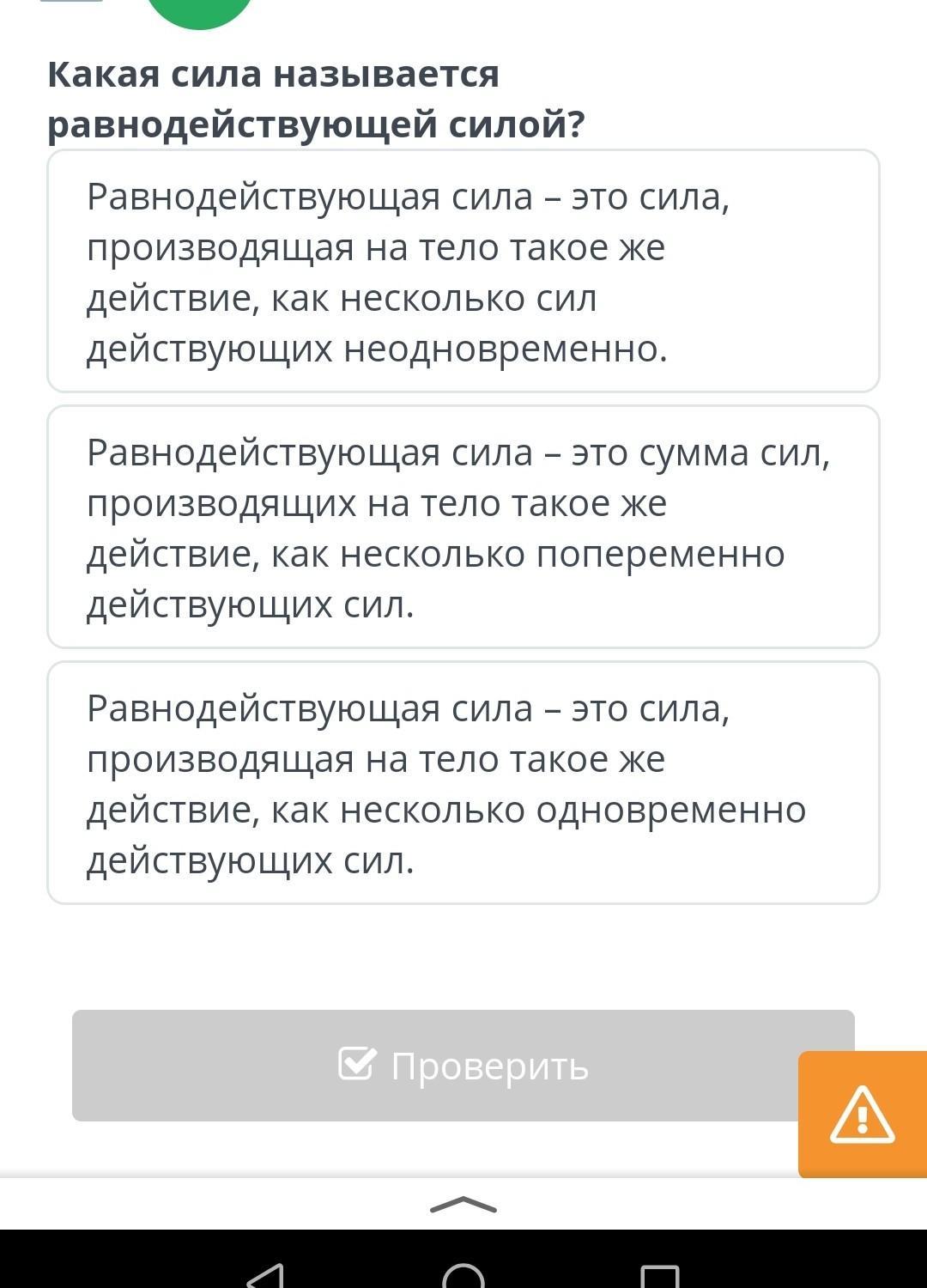 Ответ:Равнодействующая сила – это сила, производящая на тело такое же действие, как несколько одновременно действующих сил.