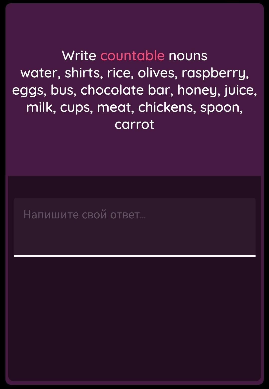 Write countable nouns water,shirts,rice,olives,raspberry,eggs,bus,chocolate bar,honey,juice,milk,cups,meat,chickens,spoon,carrot