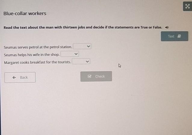 Blue-collar workers Read the text about the man with thirteen jobs and decide if the statements are True or False. Seumas serves petrol at the petrol station. Seumas helps his wife in the shop. Margaret cooks breakfast for the touists.