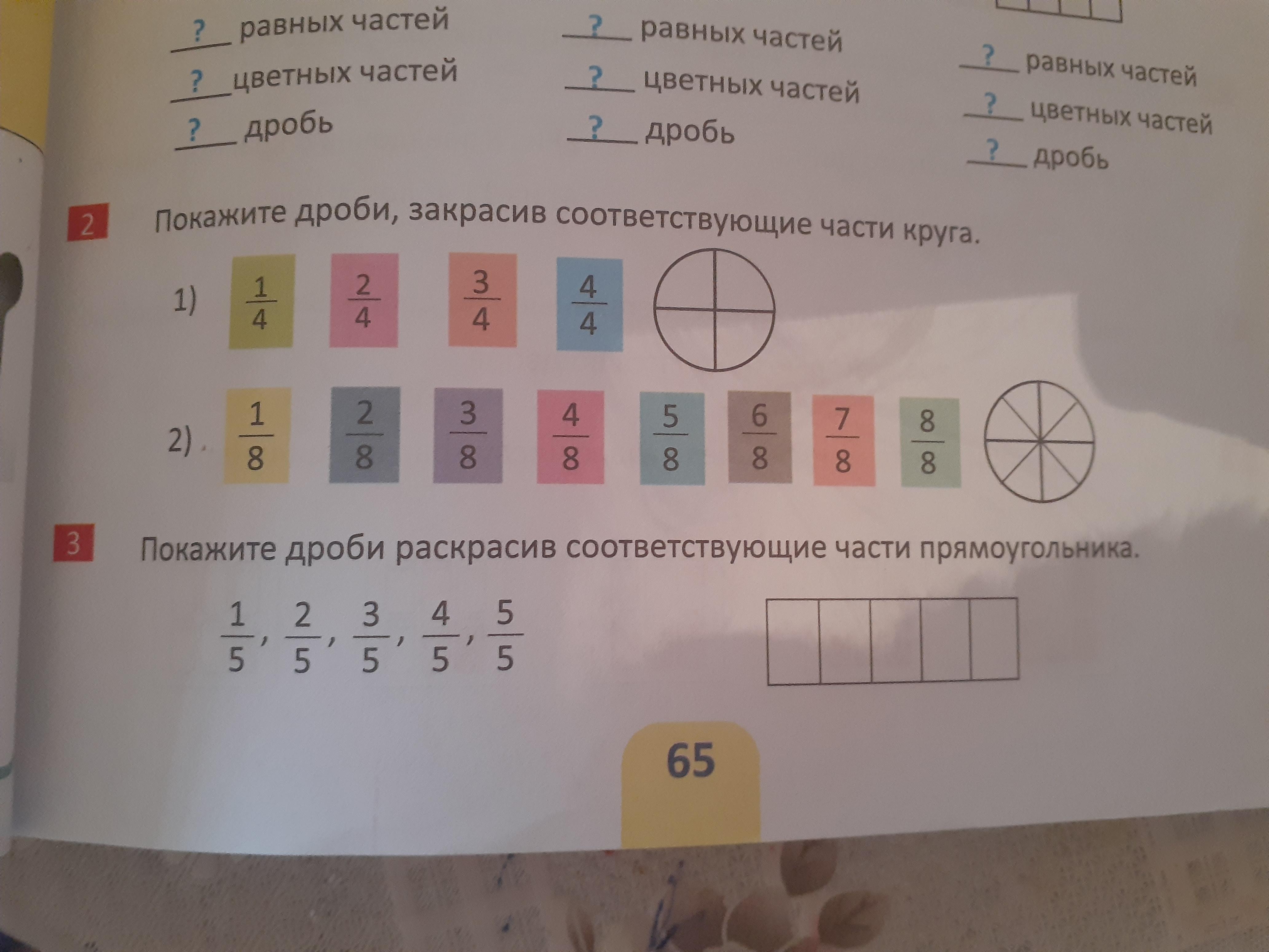 Ответ: если сверху цифра 1,а снизу два?это значит что 6адо закрасить только 1 часть из 4. Это просто пример.