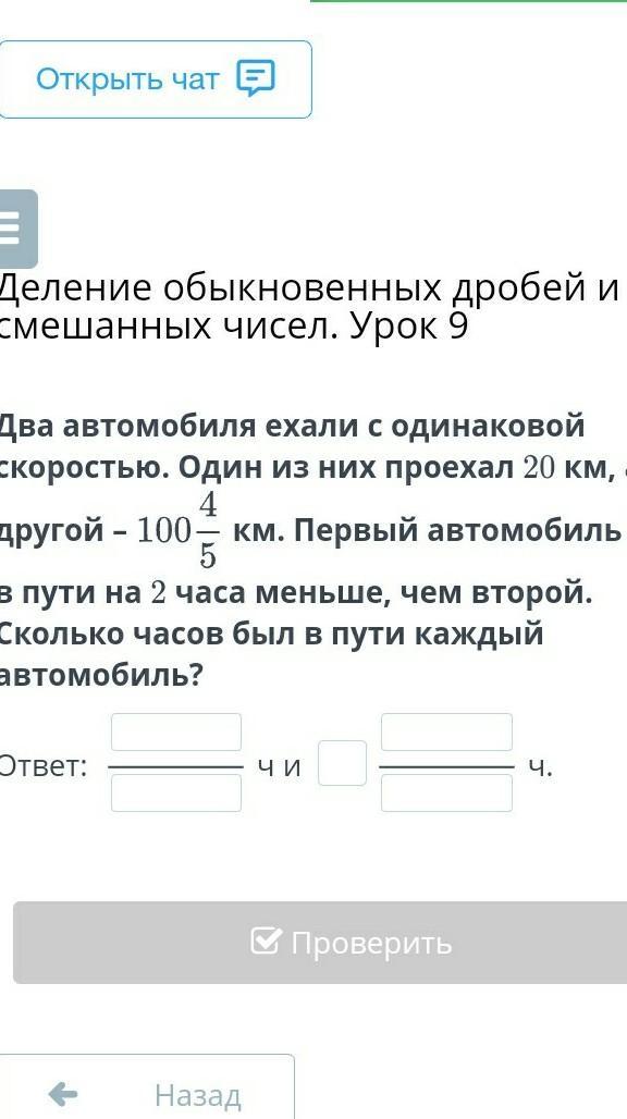 Два автомобиля ехали с одинаковой скоростью. Один из них проехал 20 км, а 4 другой - 100 км. Первый автомобиль был 5 в пути на 2 часа меньше, чем второй. Сколько часов был в пути каждый автомобиль?