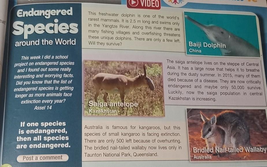 ВИДЕО Этот пресноводный дельфин - одно из самых редких млекопитающих в мире. Его длина составляет 25 метров, он плавает в урочище Янцзы. Вдоль этого берега расположено множество рыбацких деревень, и этим уникальным дельфинам угрожает чрезмерное скопление людей. Их или несколько, и выживут ли они? Дельфин Байджи Китай Антилопа наига обитает на окраинах Средней Азии. У него большой нос, который помогает ему дышать пыльным летом. В 2015 году многие из них пострадали из-за болезни, которая сейчас находится под угрозой исчезновения, и, возможно, выжило только 50 000 человек. К счастью, сейчас популяция сайгака в центральном Казахстане увеличивается. Антилопа салга Казахстанская Австралия славится кенгуру, но этот вид мелких кенгуру находится на грани исчезновения. Осталось всего 500 из-за чрезмерной охоты. Мостовидный валлаби с гвоздевыми хвостами теперь живет в национальном парке Тонтон, Квинсленд. Обузданный гвоздехвостый валлаби Австралия