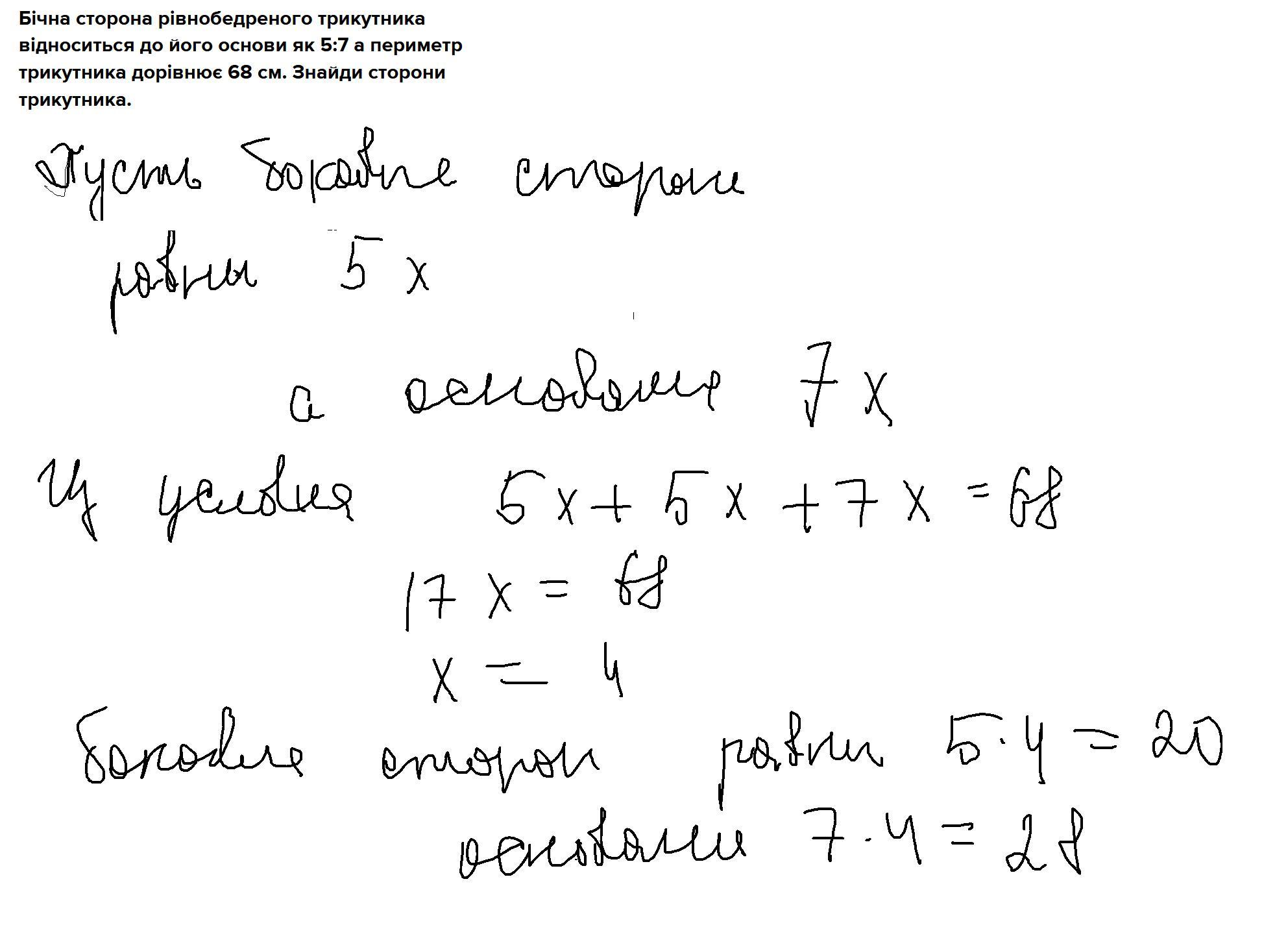бічна сторона рівнобедреного трикутника відноситься до його основи як 5:7 а периметр трикутника дорівнює 68 см. Знайди сторони трикутника.