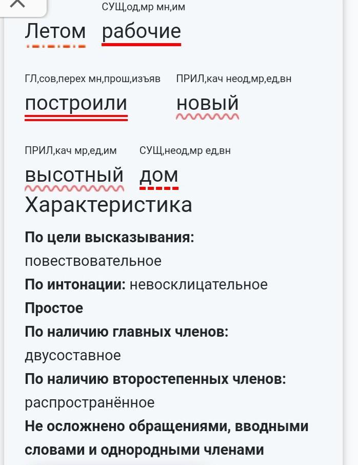 Летом рабочие построили новый высотный дом - повествовательное, не восклицательное, простое, двусоставное, распространенное