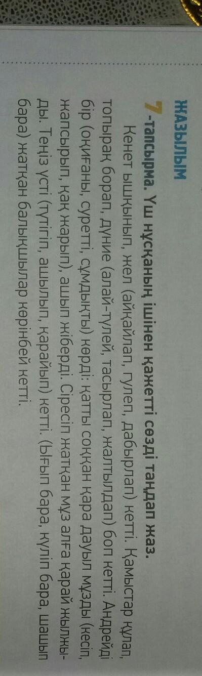 Ответ: 7-тапсырма Кенет ышқынып,жел айқалап кетті.Қамыстар құлап топырақ борап ,дүние алай-түлей боп кетті.Андрейді бір оқиғаны көрді:қатты соққан қара дауыл мұзды қақ жарып,ашып жібереді.Сіресіп жатқан мұз алға қарай жылжыды.Теңіз үсті түтігіп кетті.