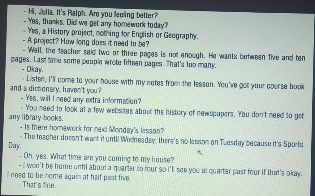 - Привет, Юля. Это Ральф. Ты чувствуешь себя лучше? - Да, спасибо. У нас сегодня есть домашнее задание? - Да, проект по истории, ни английский, ни география - ничего. - Проект? Как долго это должно быть? Учитель сказал, что двух-трех страниц недостаточно. Ему нужно от пяти до десяти страниц. В прошлый раз кто-то написал пятнадцать страниц. Это слишком много. -Слушай, я приду к тебе домой со своими записями с урока. У тебя есть учебник. Хорошо. и словарь, не так ли? Да, мне понадобится дополнительная информация? Вам нужно посмотреть несколько веб-сайтов об истории газет. Библиотечные книги покупать не нужно. - Есть домашнее задание к уроку в следующий понедельник? - Учитель не хочет до среды, во вторник урока нет, потому что сегодня День спорта. О да. Во сколько ты идешь ко мне домой? -Я не буду дома примерно без четверти четыре, так что увидимся в четверть пятого, если можно. Мне нужно снова быть дома в половине шестого. Все в порядке.