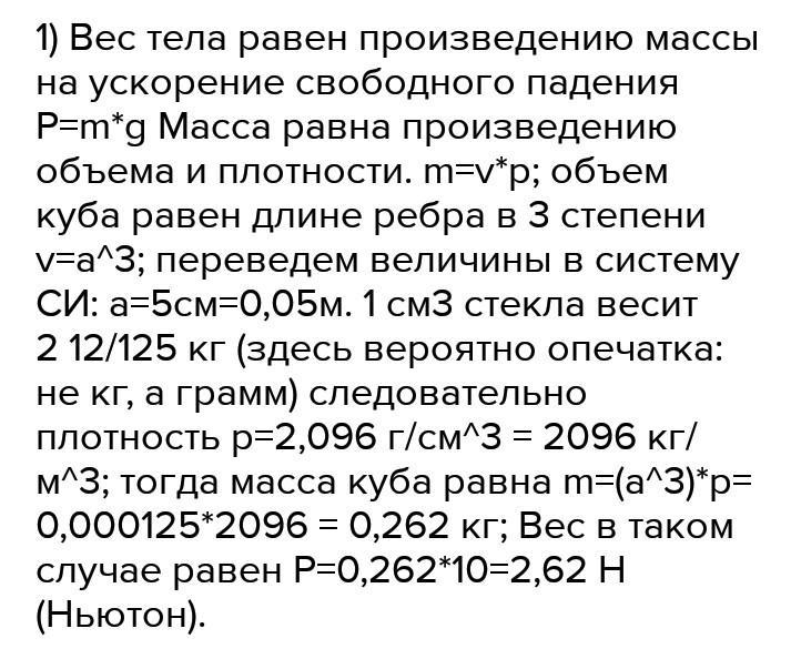 Сколько весит стеклянный кубик с ребром 5 см, если 1 см3 стекла весит  г ?