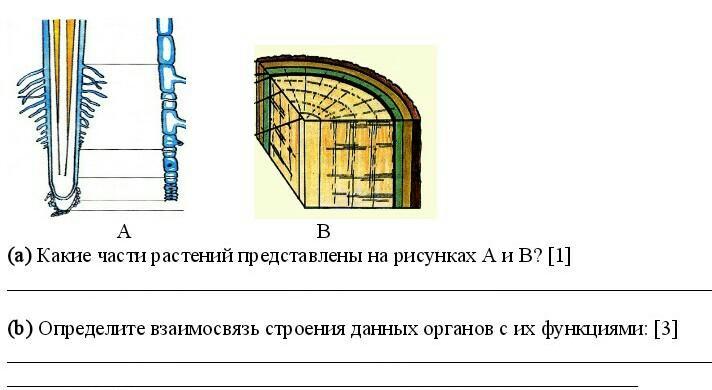 б) Корень имеет корневой чехлик (функция защиты), далее зона роста, воронки для впитывания веществ. В стебле изображена сердцевина-паренхима, ксилема или древесина (обеспечивает восходящий ток воды и растворенных веществ), камбий, флоэма (нисходящий ток, переносит пластические вещества).