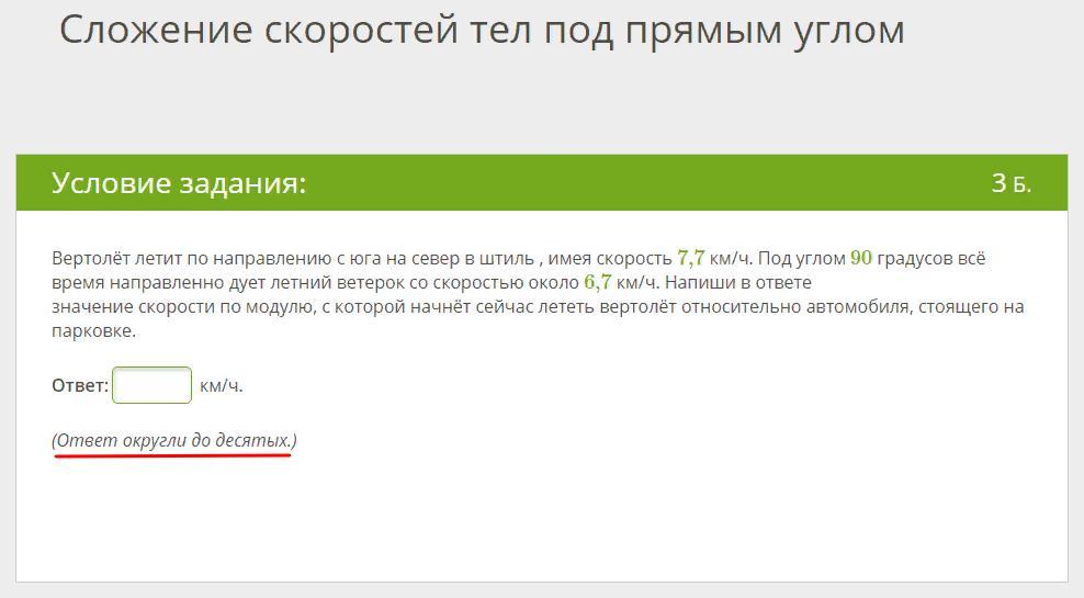 V = √(V1^2 + V2^2) = √(7.7^2 + 6.7^2) = 10.2 км/ч