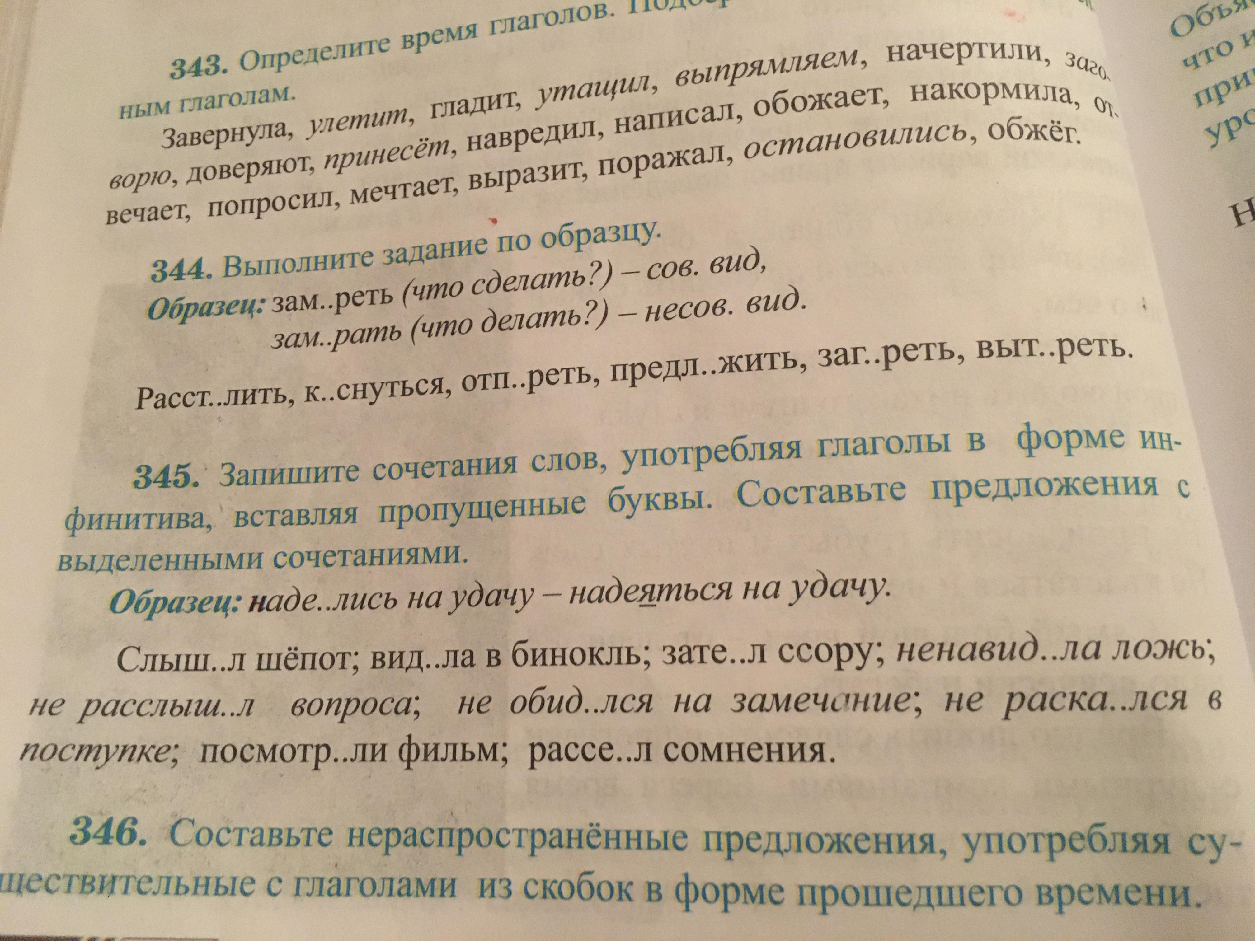 Слышать шепот, видеть в бинокль, затеять ссору, ненавидеть ложь, не расслышать вопроса, не обидеться на замечание, не раскаяться в поступке, посмотреть фильм, рассеять сомнения