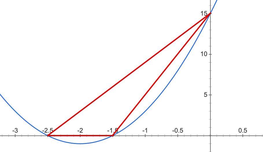 квадратичная функция задается формулой y=4x^2+16x+15.Найдите площадь треугольника,вершинами которого является точки пересечения графика функции с осями координат