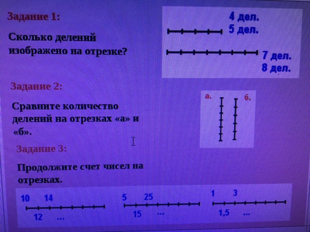 На отрезке "а" 7 делений,на отрезке "б" 6 делений,то есть на отрезке "а" на одно деление больше,чем на "б".