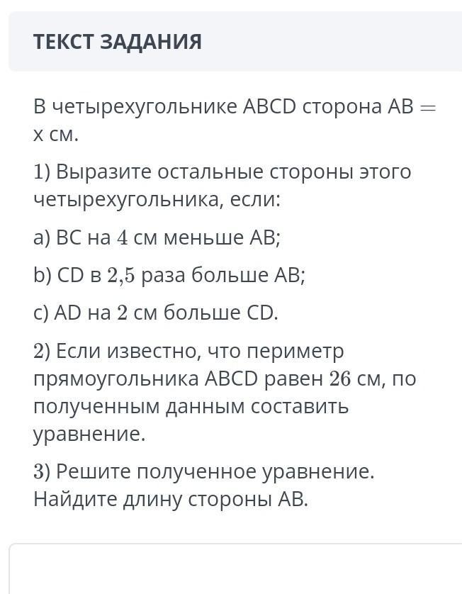 Ответ:сторона ВС равна (х-4), сторона СD равна 2,5х, AD равна 2,5х+2
