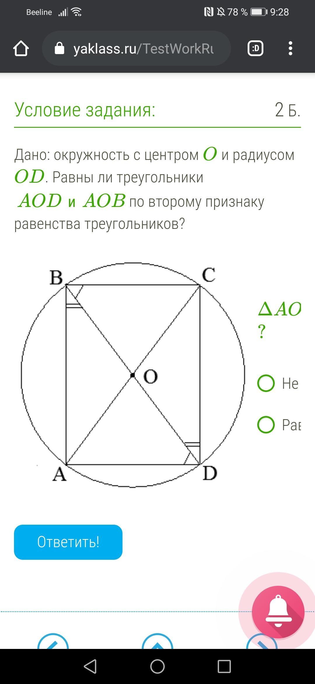 Дано: окружность с центром O и радиусом OD . Равны ли треугольники AODиAOB по второму признаку равенства треугольников?