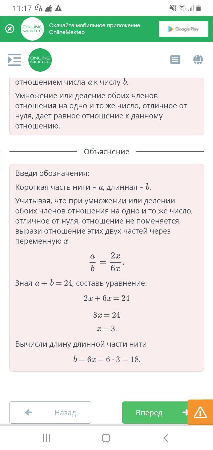Нить длиной 24 м была разделена на две части в отношении 2 : 6. Определи длину длинной ча