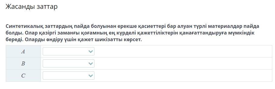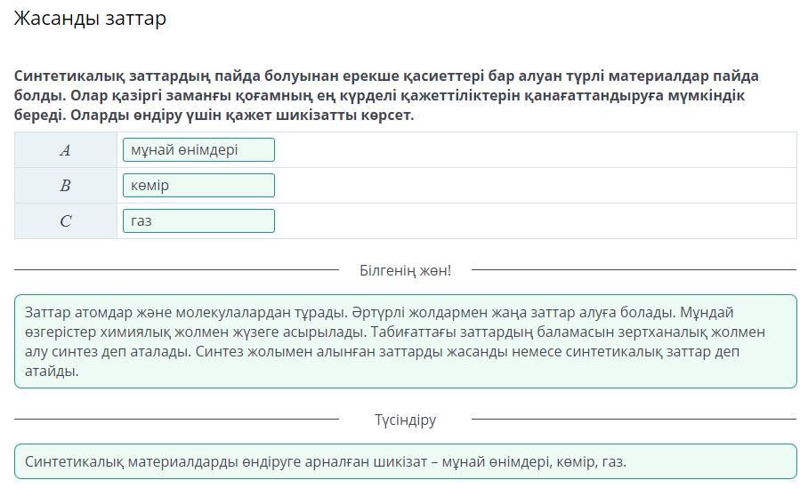Синтетикалық заттардың пайда болуынан ерекше қасиеттері бар алуан түрлі материалдар пайда болды. Олар қазіргі заманғы қоғамның ең күрделі қажеттіліктерін қанағаттандыруға мүмкіндік береді. Оларды өндіру үшін қажет шикізатты көрсет.