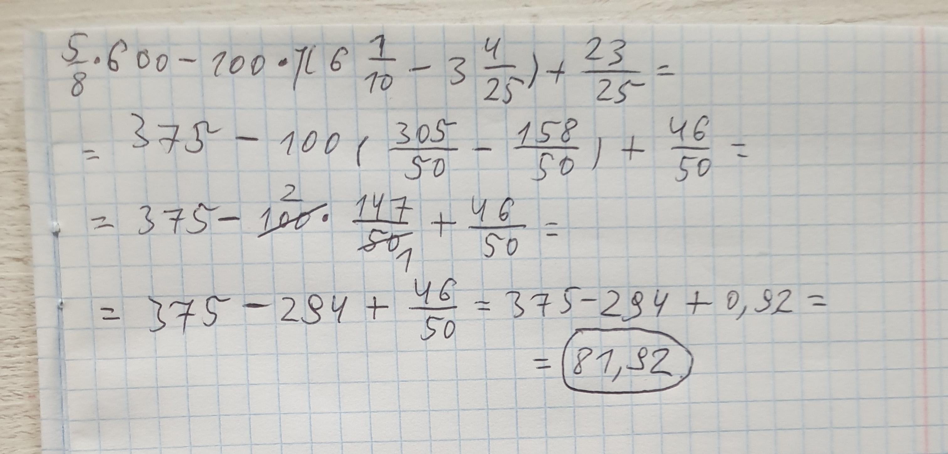 Найди значение выражения. 5/8 х 600 - 100 х 1 ( 6 1/10 - 3 4/25 ) + 23/25