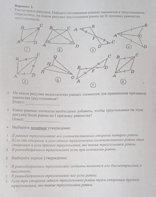 1. сторона АС общая, углы прилежащие к ней, обозначены как равные. 3. AF = FC, ∠AFB = ∠CFD как вертикальные, ∠А = ∠С по обозначению на рис.