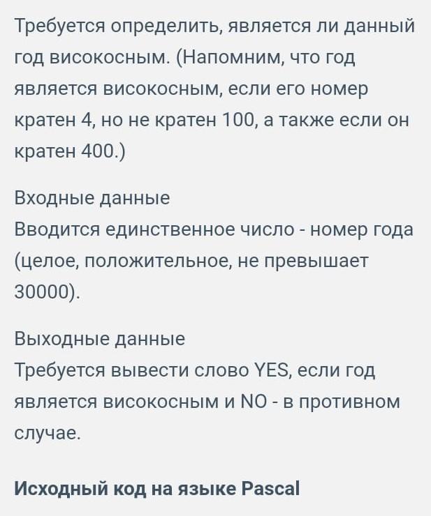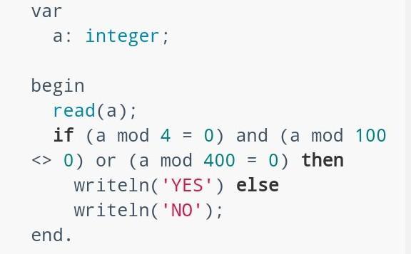 if ((year mod 4 = 0) and (year mod 100 <> 0)) or (year mod 400 = 0) then