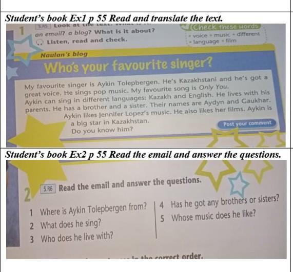 1. Мой любимых певец это Айкин Толепберген. Он казах и у него отличный голос. Поёт в жанре ‘поп’. Моя любимая песня- это ‘только ты’. Айкин может петь на разных языках: на казахском и английском. Он живет с родителями. У него есть брат и сестра. Их зовут Айдын и Гавхар. Айкину нравится музыка Дженифер Лопес. Он также любит фильмы с ней. Айкин настоящая звезда Казахстана. Вы знаете его?