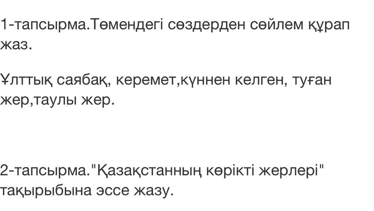 1-тапсырма.Төмендегі сөздерден сөйлем құрап жаз. Ұлттық саябақ, керемет,күннен келген, туған жер,таулы жер.