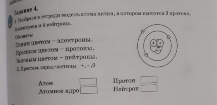 1.Изобрази в тетради модель атома лития, в котором имеются 3 протона, 3 электрона и 4 нейтрона.