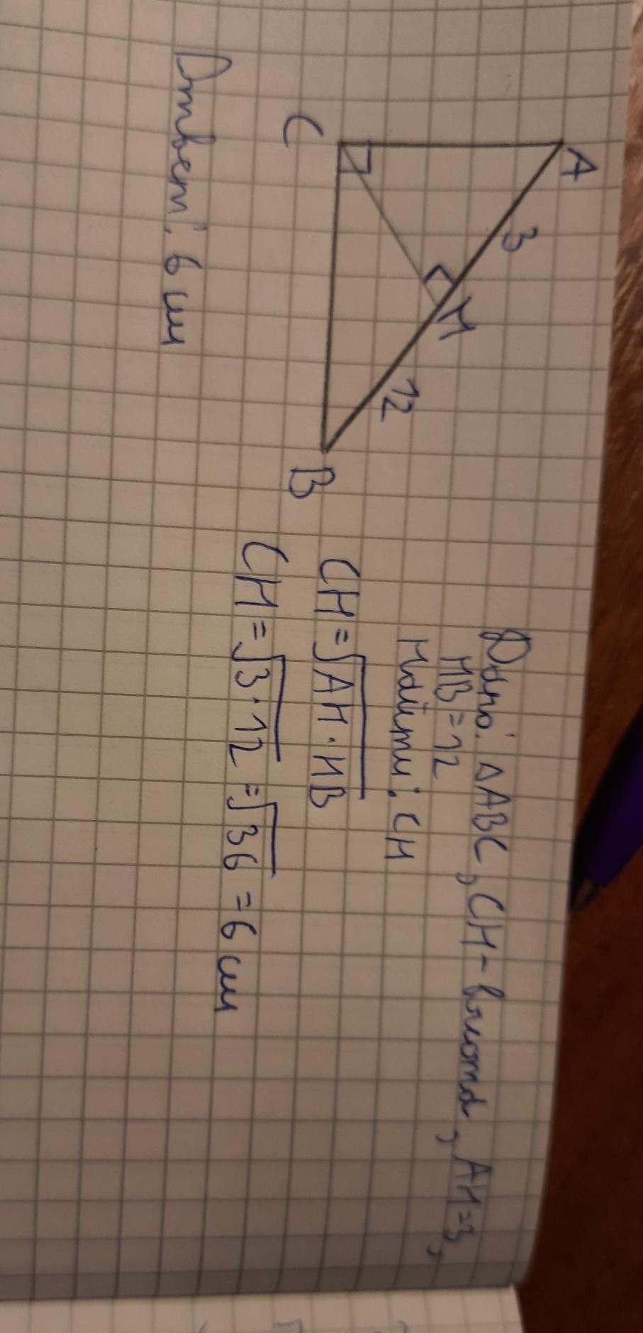 знайдіть висоту прямокутного трикутника якщо вона проведена до гіпотенузи і ділить її на відрізки завдовжки 3 см і 12 см