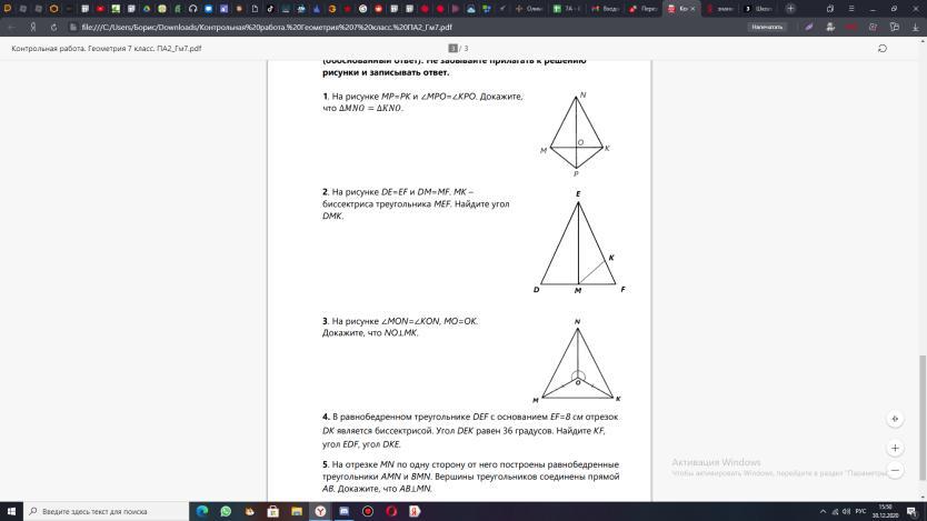 Сначала докажем = нижних тр. МР=РК, МРО=КРО(по усл.), РО общая ст. => эти тр.= (по 1 призн.).=> МО=ОК. Докажем = верх. тр. МО=ОК, ОN общ. ст. => тр. =(по 2 катетам). Что и треб. доказ.