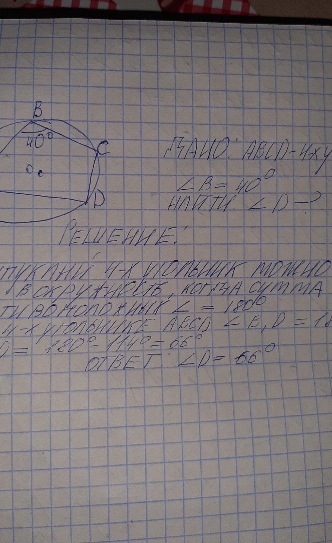 Угол В четырехугольника АВСD, вписанного в окружность, равен 114°. Найдите угол D этого четырехугольника.