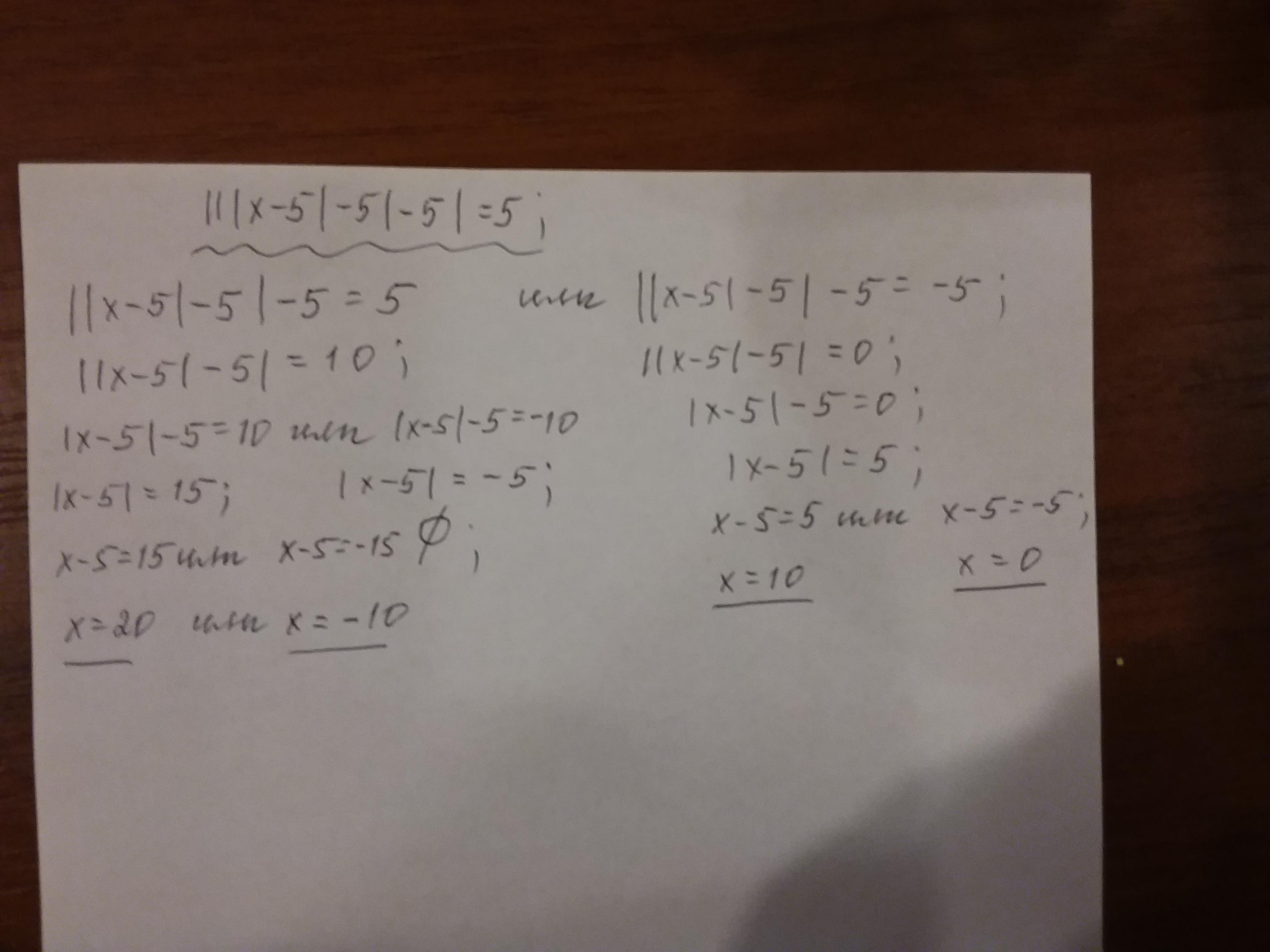 1) [[x-5]-5]+5=5 ⇒[x-5]+5+5=5⇒[x-5]=-5⇒если х-5≥0, то х-5=-5 или х=0;
