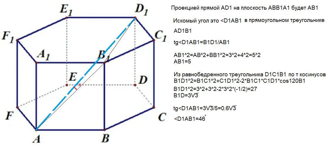 В правильной треугольной призме ABCDEFA1B1C1D1E1F1 сторона основания равна 3, а боковое ребро равно 4. Найдите угол между прямой AD1 и плоскостью ABB1
