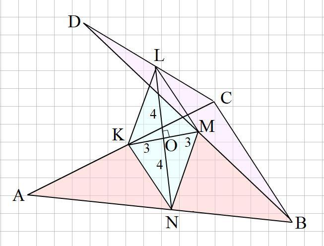 Соединим отрезками точки А и С, точки С и D, точки В и D, точки А и В и нанесём срединные точки этих отрезков K, L, M, N.
