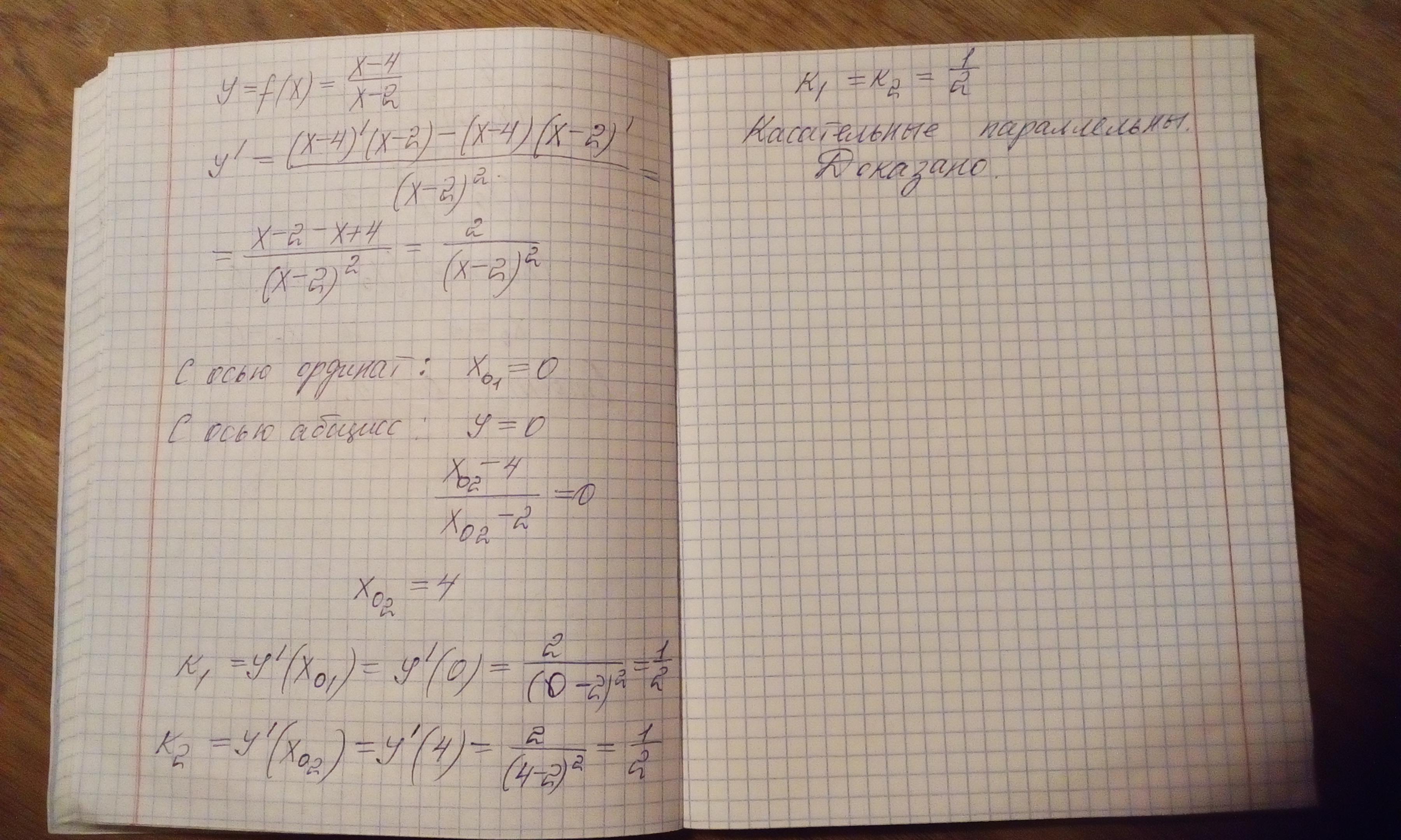 Докажите, что касательные графика y=f(x)=x-4/x-2, проходящие через точки, где график пересекает оси координат, параллельны.