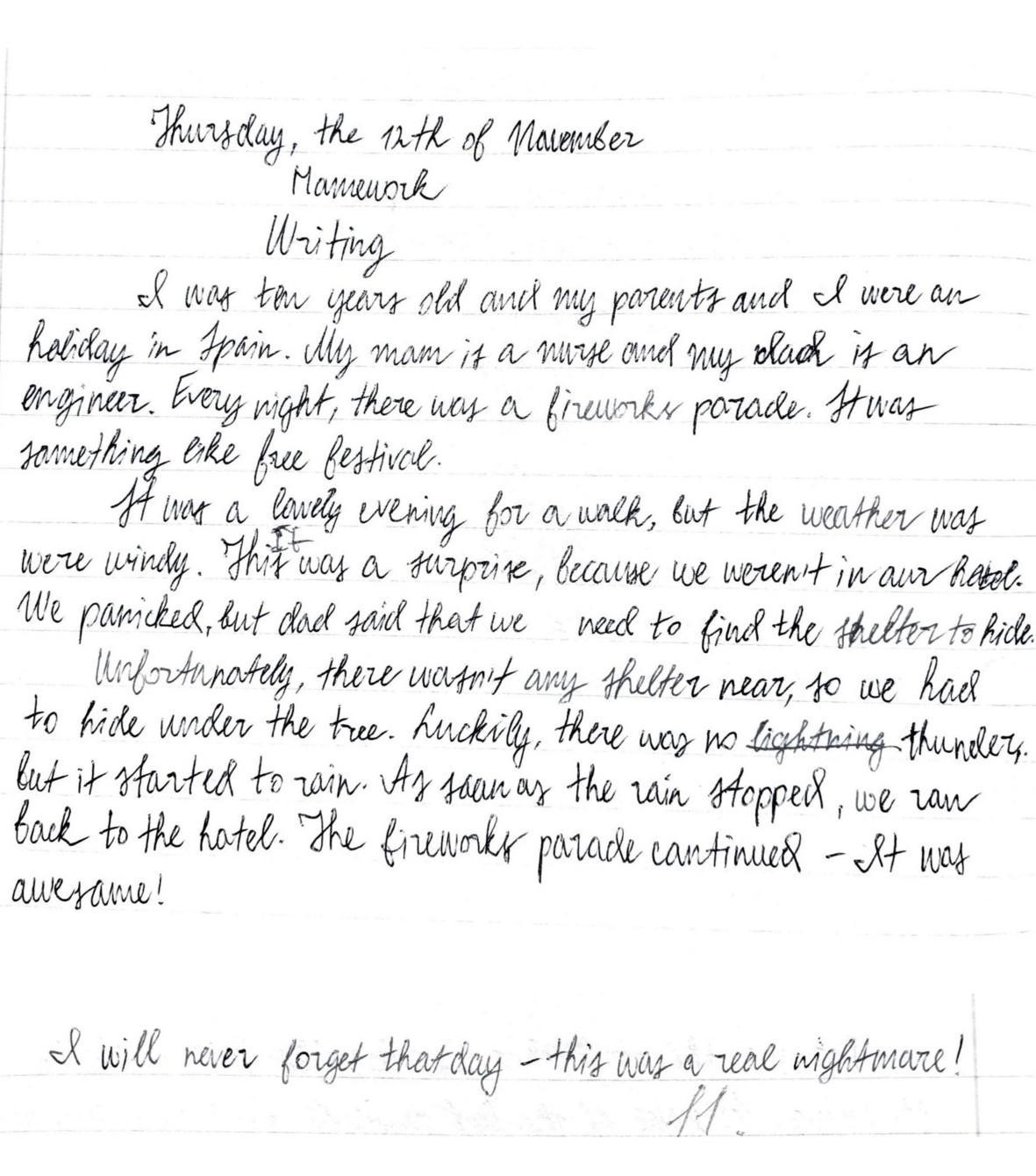 3) At the beginning I described myself and the fireworks festival, in the middle I talked about how scared I was at that moment and at the end I share my emotions about this whole situation.